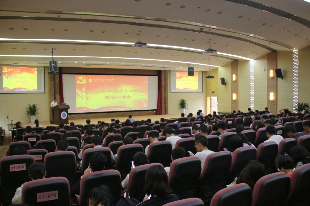 在迎接新中国成立70周年之际,9月27日下午以“奋斗新时代”为主题的海归讲堂活动在我校国际会议厅举行,这是我校首次举办海归讲堂。参加本次活动的有学校副校长、九三学社成都信息工程大学委员会主委范广洲,我校省市区人大代表、政协委员,学校各民主党派、知识分子联谊会、海外归国留学教师代表,学生工作部、党委统战部以及各学院的师生代表。会议由党委常委、党委组织部部长、统战部部长董一平主持。